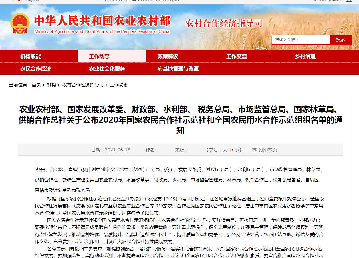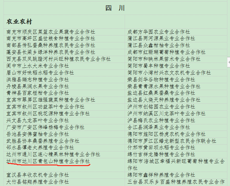 近日,农业农村部、国家发展改革委、财政部、水利部、税务总局、市场监管总局、国家林草局、供销合作总社公布2020年国家农民合作社示范社和全国农民用水合作示范组织名单,达州市达川区青包山种植专业合作社名列其中,被认定为国家农民合作社示范社。